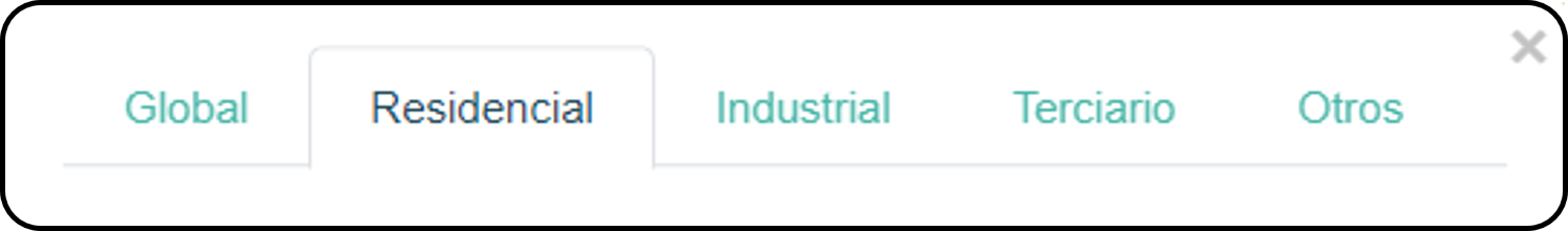 En global podemos ver los valores agregados para todo el edificio. Cuando hacemos click en Residencial, Industrial, Terciario u Otros, veremos los resultados medios para cada uno de esos usos. Es decir, si en un edificio hay 10 viviendas, en global veremos el potencial agregado de las 10 viviendas, pero en la pestaña residencial conoceremos el potencial medio por vivienda.